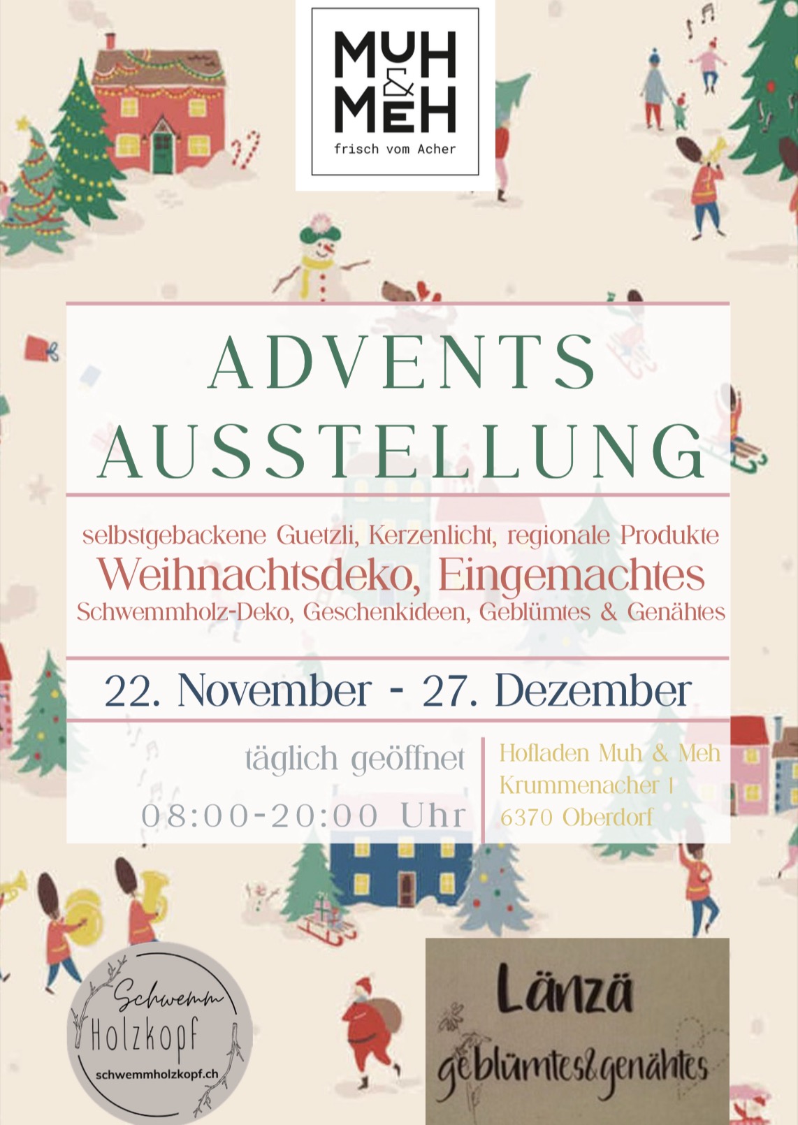 Vom 22. November bis 27. Dezember laden wir herzlich zu unserer stimmungsvollen Adventsausstellung im Hofladen Muh & Meh in Oberdorf ein.